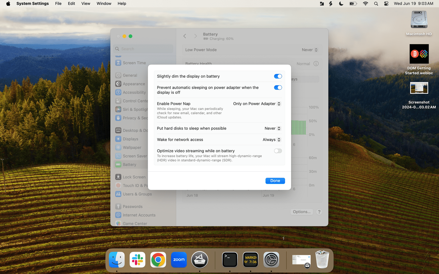 Click Battery from the menu, then choose Options. Switch on the toggle next to Prevent automatic sleeping on power adapter when the display is off.