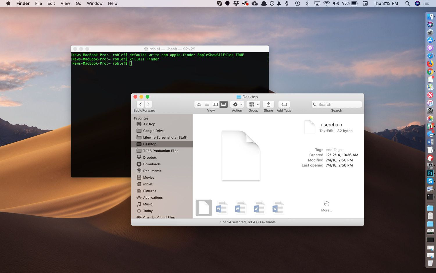 Entering the two lines above into Terminal allows you to use the Finder to display all the hidden files on your Mac. The first line tells the Finder to display all files, regardless of how the hidden flag is set. The second line stops and restarts the Finder, so the changes can take effect. You may see your desktop disappear and reappear when you execute these commands; this is normal.