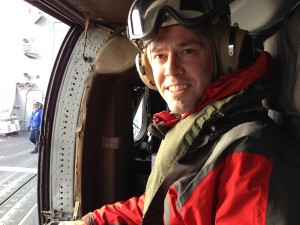 After our turn in the combat systems room, we were told the weather was going to get worse and they wanted to send a helo to pick us up about an hour early to ensure we weren't all stuck on board for the night (though all of us would have gladly stayed aboard if given the chance). We gathered our things, finished our briefing with the captain and headed to the helo hangar to await our ride home. The helo arrived but had to circle for about twenty minutes waiting for a "green deck", which was the clearance from the ship's air controller to land. While the ship has the capability to land a helo in literally any sea-state and weather condition, as stated before, when civilians are aboard, they get very conservative and don't take unnecessary risks. We were literally about 4 minutes from being called off and staying aboard for the night when the helo finally got clearance to land. I watched it come in through a portal window in the exterior door and it was an awesome sight getting to see it land on a moving deck in the slightly rough seas. We were then given our flight gear by the helo crew and instructed to follow them out and get aboard. I was asked to sit in the port side gunner's window seat on the way back, which was fantastic. To get to fly off a ship and over the Pacific Ocean with a giant open window in front of me was a great way to end the exciting day. The flight back to N.A.S. North Island took about 40 minutes and after landing, we got a final debriefing and headed off on our way.