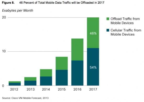 The key take away from this year's report, however, is the dramatic shift of mobile traffic offloaded to small cells, primarily Wi-Fi. The chart below (Figure 8 from the mobile VNI report) illustrates how mobile offload increases from 33 percent of total mobile traffic (cellular plus small cell/ Wi-Fi) in 2012, to 46 percent in 2017. This is significantly larger than we forecasted just a year ago when we estimated mobile offload would comprise 11% of total traffic in 2011, growing to 22% in 2016.