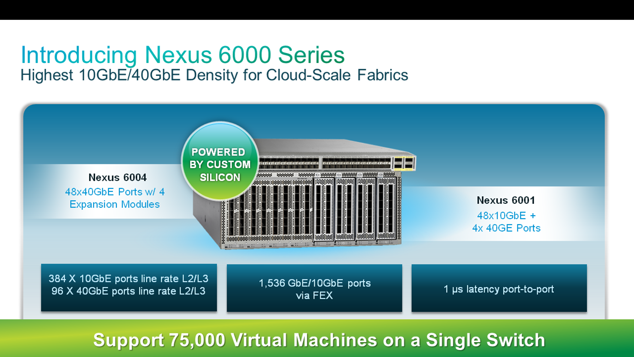 - Industry's highest density L2/L3 10G/40G switch: Building upon our previous announcement of redefining fabric scale, this time we introduces a New Nexus 6000 family with two form factors -6004 and 6001. We expect these switches to be positioned to meet increasing bandwidth demands, for spine/leaf architectures, and for 40G aggregation in fixed switching deployments. We expect the Nexus 6000 to be complementary to the Nexus 5500 and Nexus 7000 series deployments, and is not to be confused with the Catalyst 6500 or Nexus fabric interconnects.