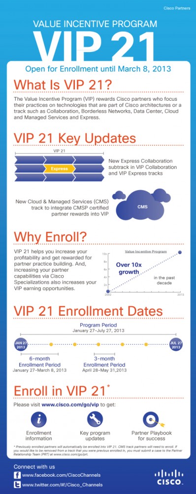 VIP 21 is available to all of our Cisco specialized, certified, and Authorized Technology Partners (ATP) who promote the adoption of Cisco architectures (Borderless Networks, Collaboration, Data Center, Cloud and Managed Services, and Express) within the current six month program period.