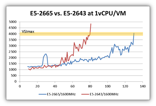 Not so fast! We tested servers with both processors with 1vCPU virtual machines and graphed the results below. To refresh your memory on the test methodology and the meaning of VSImax, refer back to Tony's introduction. The graph shows latency on the Y axis and number of desktops on the X axis. As we increased the number of virtual machines (virtual desktops) per host, we found that latency as reported by LoginVSI was comparable up to around 40 or 50 desktops (we will analyze this part of the curve in more detail in a later post). At that point, the two curves began to diverge sharply. The E5-2643 based host exceeded VSImax at 81 virtual desktops while the E5-2665 based host had a very linear response to increased density past 100 virtual desktops. The E5-2665 based host did not exceed VSImax until 130 virtual desktops -60% better density than the E5-2643 based system! This result strongly suggests that core count has a much greater impact on virtual desktop density than CPU speed.
