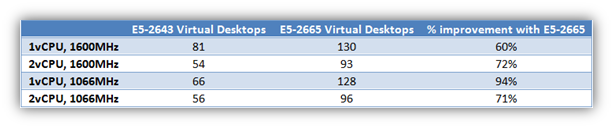 What about 2vCPU virtual desktops? We tested that, too, since a fair number of our customer projects involve some number of users (an overwhelming minority) who require or who demand 2 vCPUs. Both systems obviously hit VSImax at a much lower density when each virtual desktop was allocated 2 vCPUs. You might expect to achieve half the density, but it was actually much better than that. In fact, the E5-2643 based system exceeded VSImax at 54 desktops while the E5-2665 based system exceeded VSImax at 93 desktops (72% more desktops than the E5-2643 based system). This result also strongly suggests that core count has a much greater impact on virtual desktop density than CPU speed.