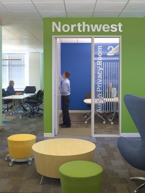 The new on-site spaces include Quiet Rooms if you need deep focus, Project Rooms for group collaboration, Audio Privacy Rooms for phone calls, and Day Lockers for use during a meeting or lunch. Employees also get IP phones with Extension Mobility and access to conference rooms with Telepresence.