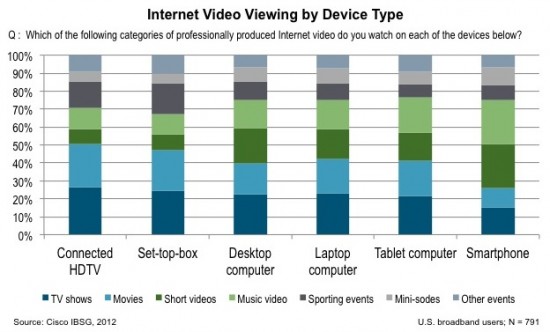 In general, these habits don't vary much by device. One exception is mobile devices, where short videos and music videos clearly dominate. This is in contrast to the general online video growth trends, which have been relatively flat in terms of the number of videos watched, while the length of video viewing has been increasing. This interest in short videos on mobile devices points to a significant opportunity in short videos of various genres targeted at a rapidly increasing mobile base.