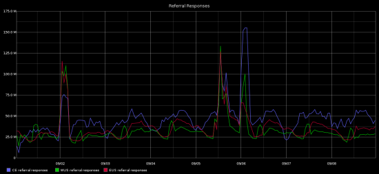 Given that the query packet was approximately 72 bytes and the response packet was about 159 bytes (yielding a 2x multiplier), this attack can probably be classified as a some sort of a low-rung DNS amplification attack. Figure 2 shows the referral response traffic spikes (click to enlarge):