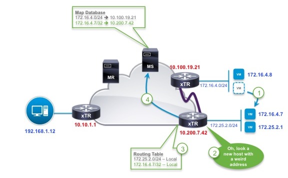 Any brand new conversations destined for 172.16.4.7 are easy, they will go through the normal LISP map-request/map-reply process, so pretty simple on that front.