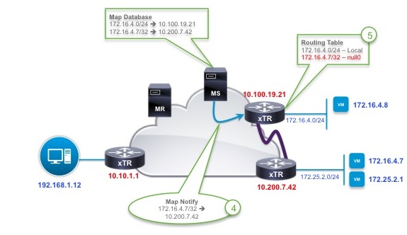 The MS now sends a map-notify message back to 10.100.19.21 and lets it know its no longer responsible for 172.16.4.7. The 10.100.19.21 then installs a "null0" destination in its routing table for the specific /32 address.