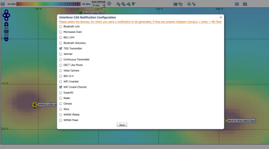 Now, the user can specify to be notified if a particular type (i.e.. Video or Bluetooth) of interferer is seen on a particular floor, building or campus. This way, anytime a Bluetooth is seen on the floor, the NCS will receive a notification suggesting the same. And to do all this, the user has to just go to a particular network design and select the particular interferer from the list that is shown after 'Configure Interferer Notifications.'