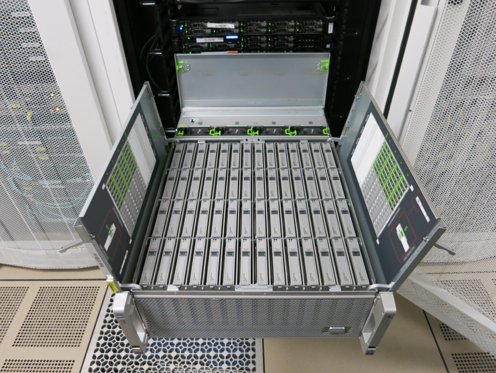 Doors on the top open with easy to use latches exposing 56 vertically oriented data drive slots which can host SSD or SAS drives. Drive carrier adapters are removed by pressing a single release button and can accommodate either a 2.5" small form factor drive or a 3.5" large form factor drive.