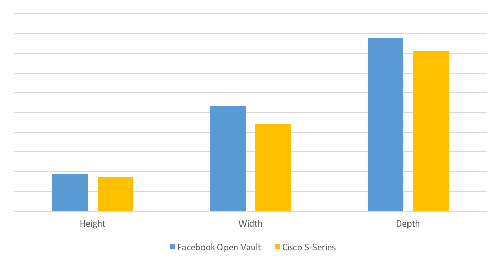 You might look at the chart and say "that's not a big difference". But it is a big difference if one or two inches prevents you from inserting your new chassis into a rack due to width or close and secure a door due to depth. Although this isn't a problem for Facebook or Open Compute adopters. Open Vault was designed to go inside their custom designed Open Rack system that is wider and deeper than standard racks to accommodate their own custom designed servers, storage and networking gear.