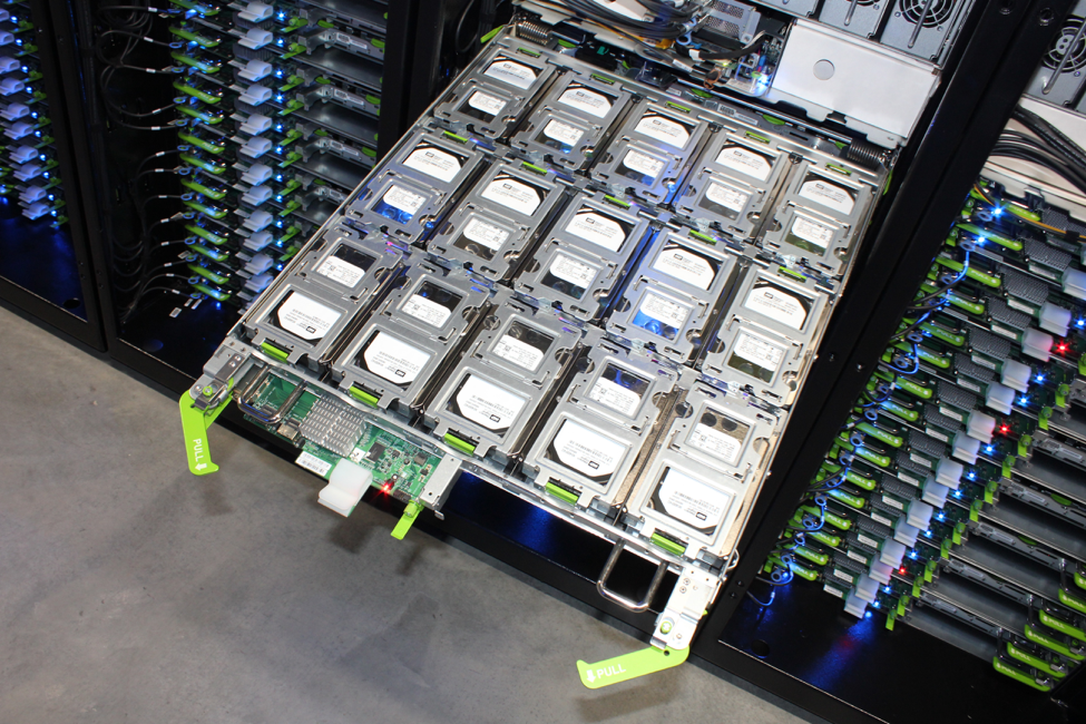 In 2013 Facebook contributed to their Open Compute Project a hardware design called Open Vault for high volume data storage. This is a 2RU dual-tray modular disk enclosure supporting up to 15 3.5" HDDs per tray and designed initially as JBOD storage. Products like this are great for serviceability where hardware design can have immediate value to ongoing operations.