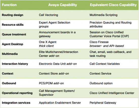 Do you have applications similar to Avaya CMS, Call Vectoring, and Session Manager? Yes. Cisco has a mature platform with equivalent or more robust capabilities due to a more modern architecture that provides greater inherent extensibility. The following table provides examples of baseline capabilities between the two companies. One significant difference: Cisco builds many of these capabilities directly into the base solution, whereas Avaya requires add-ons.