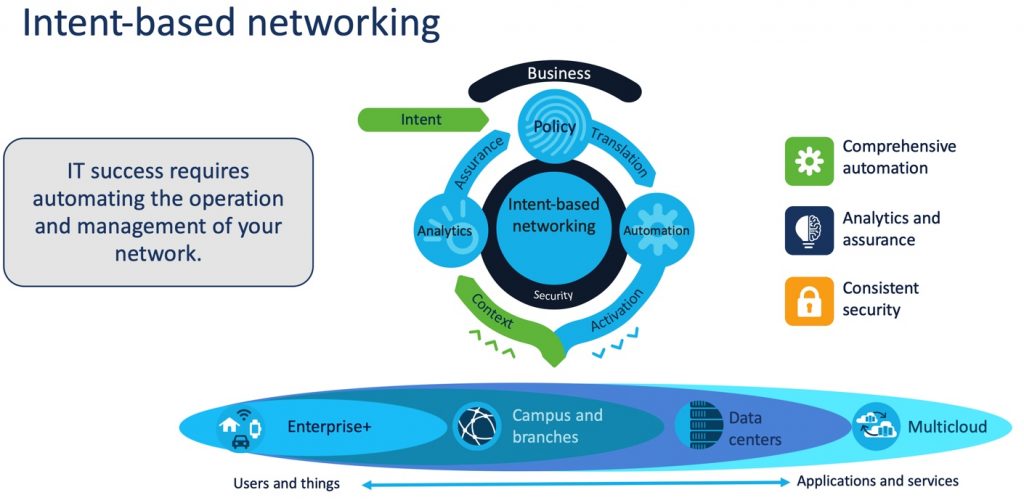 So, how do we solve the issue of not being agile enough? The answer is Intent Based Networking. It describes a closed loop system approach to bridging between the intent of the business or IT and the services the network delivers to support that intent.