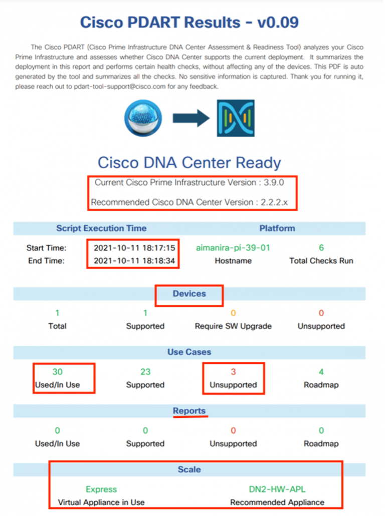 Customers who look at all the above details and realize that they had no idea about some of the features and functionalities they had in use. As you can see, this report summarizes everything configured in your Cisco Prime Infrastructure and performs health checks. The outcome is the analysis of where your environment stands and how ready it is to migrate to DNA Center. It highlights devices, reports and use cases that can be migrated, and what devices need to be upgrade first, as well as hardware that is incompatible with Cisco DNA Center for you to make an educated decision on the migration.
