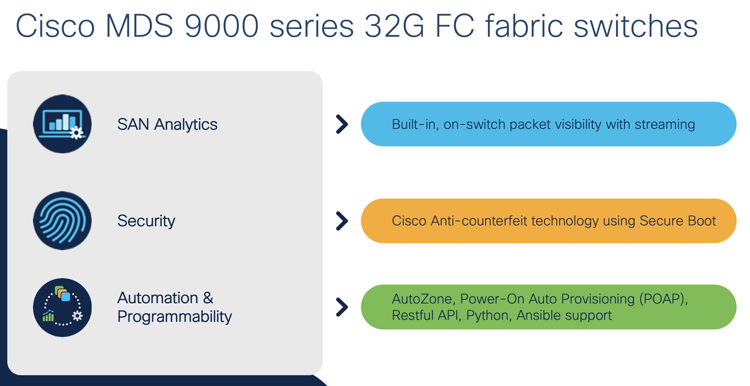 - SAN Analytics. Dedicated hardware to support Cisco's unique cost-effective, simple, and secure solution for deep packet visibility across the fabric.