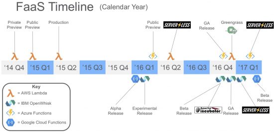 Last November/December saw Azure and IBM go into GA releases and IBM choose to contribute their OpenWhisk offering to the Apache Foundation as an incubator project. Google followed along with their own beta status this past March and the team at the Serverless Framwork now offers support for all four platforms.
