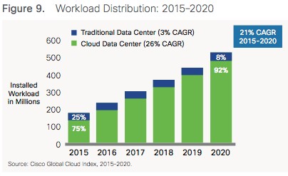 Our latest Cloud Index report, released earlier this month, continues to affirm this inexorable shift. From 2015 to 2020, cloud data center traffic will grow at a clip of about 30% year on year (see above charts). By 2020, the cloud will outpace traditional center growth with 92 per cent of workloads (see below workload distribution) processed by cloud data centers, data stored in data centers will quintuple by 2020 and 68 percent of the cloud workloads will be in public cloud data centers.