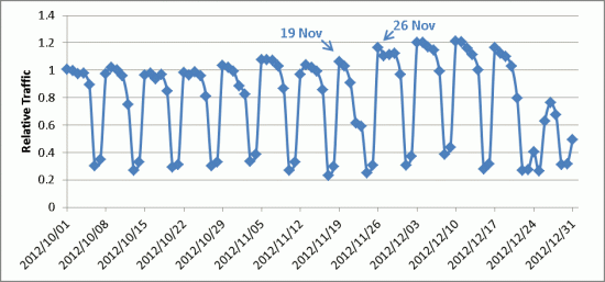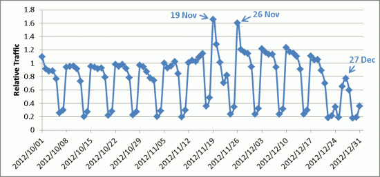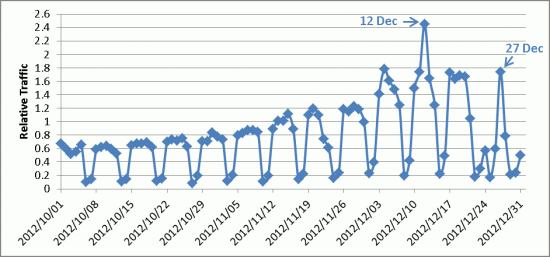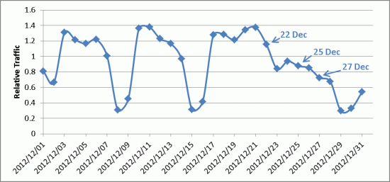 Thursday, December 20, marks a clear change in browsing behaviour. Traffic on Friday, December 21, is lower than would be expected for a Friday, and the rise on traffic on the following Sunday is not seen. Traffic on Christmas Eve is about 40% of a normal weekday. However, the amount of traffic on Christmas Day, 24% of normal, isn't noticeably different from that of a typical Saturday.