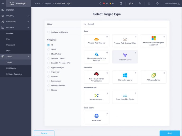 Intersight targets are hardware or software infrastructure components from which Intersight receives information and, in many cases, to which Intersight can send relevant actions. Hardware targets include infrastructure such as servers, Fabric Interconnects (FIs), HyperFlex clusters, network switches, APIC clusters, or other hardware endpoints. Software targets may be hypervisors, Kubernetes clusters, public cloud services, an Intersight Appliance, or other software endpoints. Intersight targets aren't specific to IWO -for example, a VMWare vCenter target can be used both by IWO and by Intersight Cloud Orchestrator (ICO).