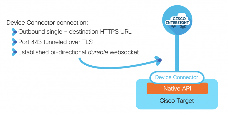 When a hardware device with an embedded Device Connector is powered on and connected to the network, the Device Connector will attempt to reach out to intersight.com and make itself available to be claimed by a unique Intersight account. Once claimed, the Device Connector will maintain the secure connection and attempt to re-establish it wherever the connection is severed by a network outage, device reboot, etc.
