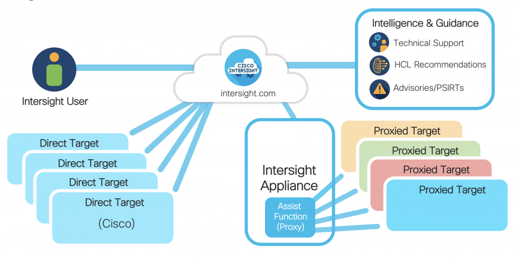 While the hardware-embedded Device Connector is an excellent solution for Cisco devices, the problem of connecting to non-Cisco hardware and software on-premises remains. The solution is to take the same Device Connector logic and, rather than try to coax third parties into embedding it in their targets, make it available through an on-premises virtual appliance as its own function: the Assist Service, sometimes referred to as Intersight Assist.