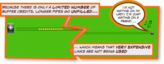 Obviously, if you want to go fast and you want to go far, you need a lot of buffers. Also note that this assumes a frame size of about 2Kb. If you have smaller frame sizes you will need more credits (remember 1 credit = 1 frame, no matter what its size).