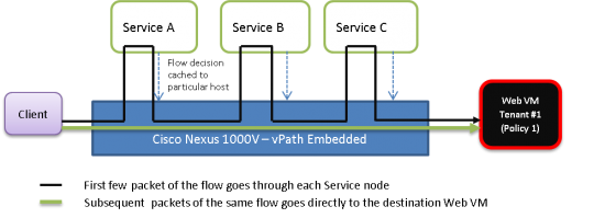 #2 -vPath enables Distributed Cloud Network Services: As noted in the picture above, vPath controls the packet flow through all Services that are chained for that particular policy. Once the first few packets of the flow is inspected by each Service node, vPath offers the capability to off load flow decisions of the particular Service to the local host such that the subsequent packets of the same flow are locally inspected at the host. Through this mechanism, vPath improves the performance of the particular service since the subsequent packets of the flow are no longer required to be inspected by the individual Service node and hence enabling distributed behavior of the particular service.
