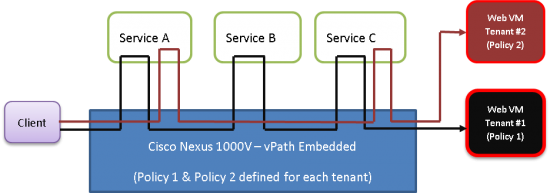#1 -vPath Powered Service Chaining at a tenant level: For customers to create multi-tenancy architecture today, they have to configure the different network services and manually "stitch" them together for every unique combination. While this method provides the goals for regulatory compliance, security and service levels it often increases application provision time, and does not easily support application mobility. Additionally most applications have to follow the same manually stitched network services.