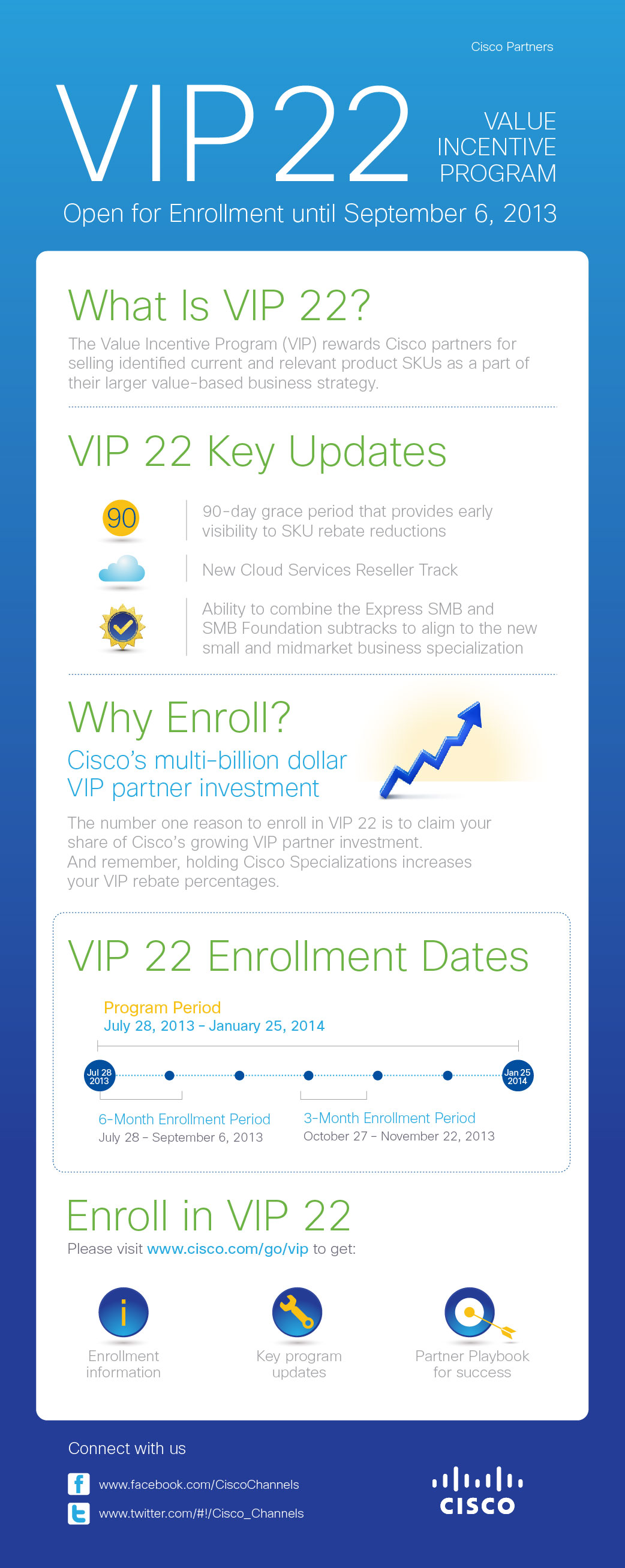 VIP 22 is available to all of our Cisco specialized, certified, and Authorized Technology Partners (ATP) who sell Cisco architectures (Borderless Networks, Collaboration, Data Center), Cloud and Managed Services, and SMB (Express) within the current six month program period.
