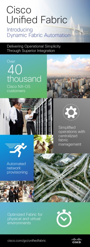 The good news is that Cisco continues to evolve its Unified Fabric to address these needs. The new Cisco Dynamic Fabric Automation delivers unsurpassed operational simplicities through superior integration. It does this by ......automating device configuration...automating fabric configuration for virtual machine (VM) deployment and migration...integrating bare-metal and virtualized resources without the need for a dedicated gateway...providing tenant awareness to the fabric management layer...simplifying day-to-day operations...and supporting scalable multi-tenant cloud deployments.