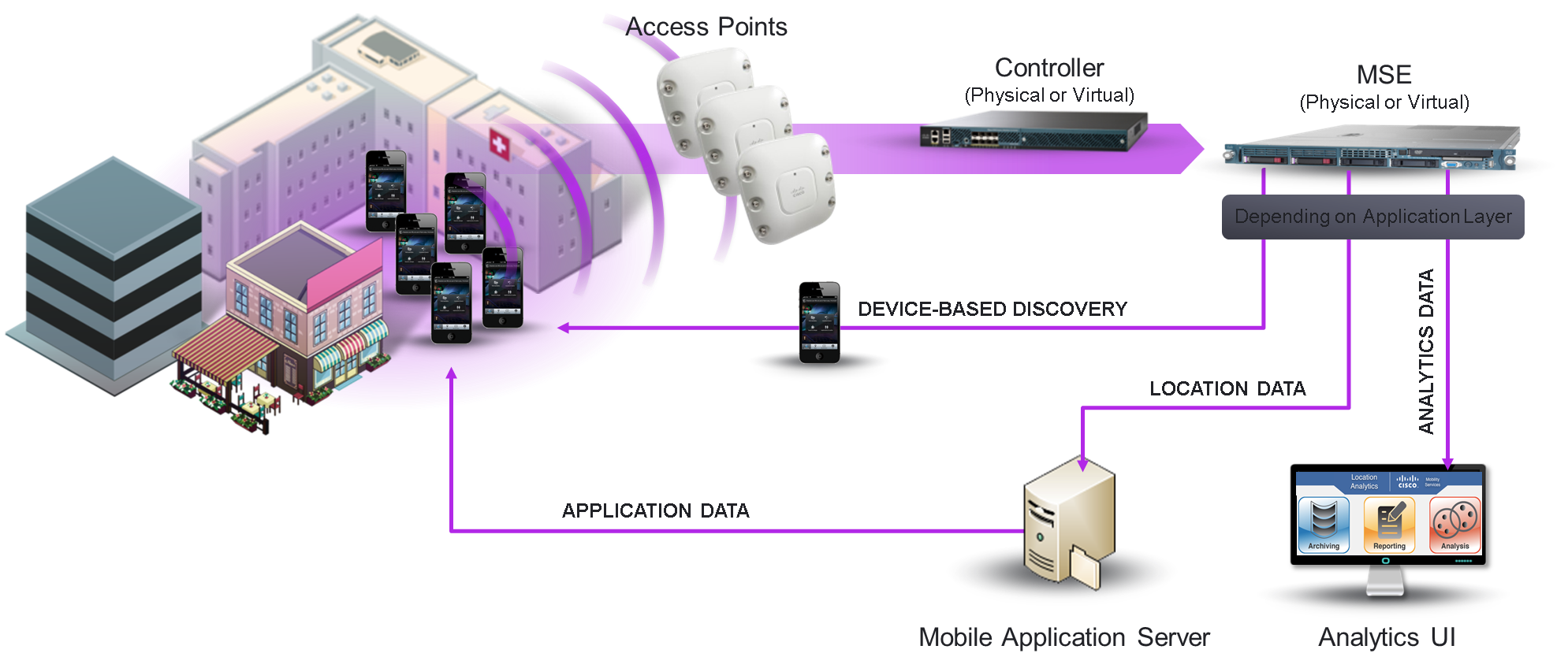 The Connected Mobile Experiences solution uses Cisco Wi-Fi infrastructure-access points, controllers, Mobility Services Engine (MSE), and management -to detect, connect, and engage end users and to provide unique insight to venue owners through location analytics.