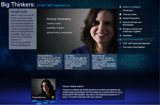 There are a couple things that are going to make mobile operators successful from small cells. Certainly I look at the unlicensed technologies, SP Wi-Fi, as a source of offload for users, but how do operators monetize? The ability to have location based services and analytics as a value add that operators can use as monetization opportunities to help creates a sustainable, scalable ecosystem for the operator. When looking at the licensed small cells, operators have leveraged the spectrum they own to help enterprises create better coverage and capacity for their end user. The world of small cells has a large potential to revolutionize the way consumers access data and cellular networks. To learn more about different Market Perspectives and Small Cell Experiences from other fellow Big Thinkers in Small Cell, please visit http://www.cisco.com/go/bigthinkersinsmallcells .