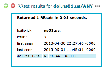 Passive DNS shows that the first sighting of dol.ns01.us was April 30, 2013, and the name is associated with IP address 96.44.136.115.