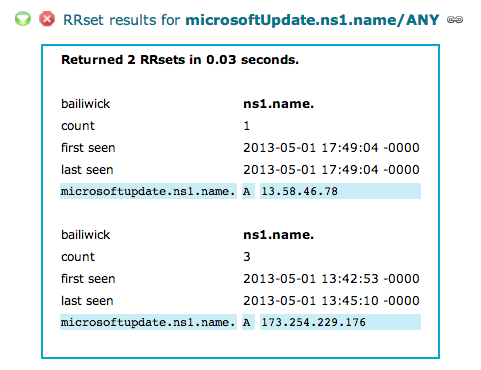 Reportedly a phone home server is located at microsoftUpdate.ns1.name, another changeip.org address. This was hosted on two different IP addresses previously: