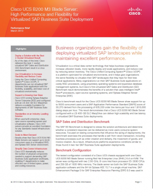 On March 19th, 2013 Cisco announced the best 2-socket virtualized SAP Sales and Distribution (SD) Benchmark result in a Linux environment with the Cisco Unified Computing System™ (Cisco UCS®) delivering high scalability and low latency in virtualized SAP Business Suite deployments.