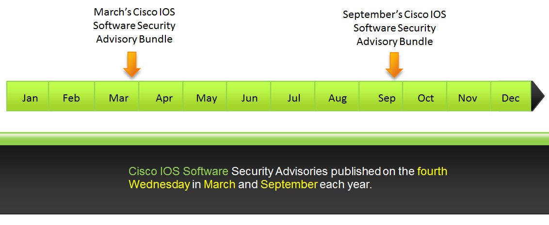 In direct response to customer feedback, Cisco releases bundles of Cisco IOS Software Security Advisories on the fourth Wednesday in March and September each year. This schedule applies to the disclosure of Cisco IOS Software vulnerabilities and does not apply to the disclosure of vulnerabilities in other Cisco products.