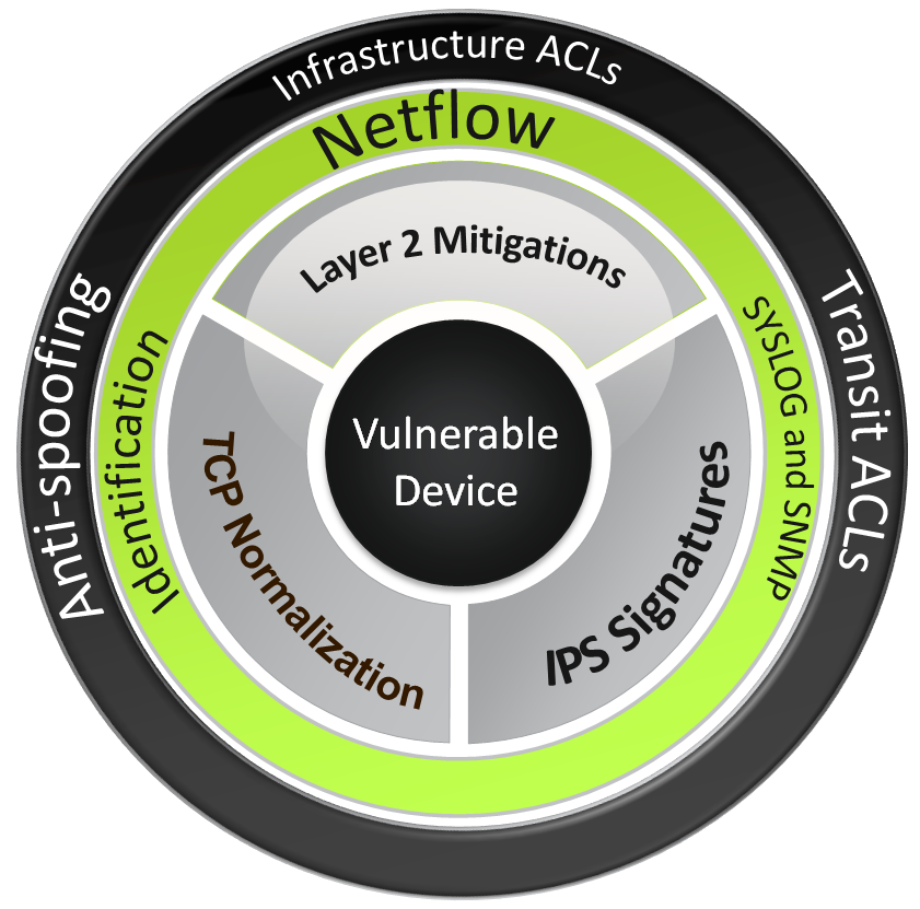 As you can see in this network topology, there are many network devices that can provide different mitigation and identification capabilities. For instance, adjacent switches can provide Layer 2 mitigation capabilities. Cisco ASAs can be configured to only allow transactions from trusted devices or block specific exploit traffic. They can also provide visibility through syslog messages and counter values displayed in the output from show commands that may be included within the AMBs, where applicable. Cisco IOS NetFlow records can provide visibility into network-based exploitation attempts. Some of these techniques and "device roles" are illustrated in the following figure.