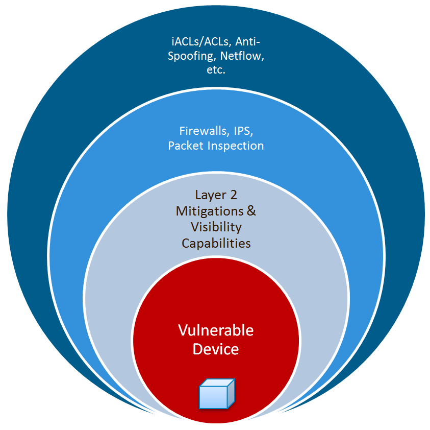 Typically, these types of diagrams include resources that surround a "critical system" (in this case the vulnerable device) that you want to protect. The illustration in the onion diagram above helps you visualize and understand the different layers of protection you can apply within your network to protect affected devices. You can also visualize packet flows and understand how security policies can be applied to each network device to protect critical systems and the infrastructure as a whole. You can identify where you can apply the technologies that enable you to gain and maintain visibility of what is happening in your network, as well as apply security policies and identify "choke-points." A different example is shown in the diagram below: