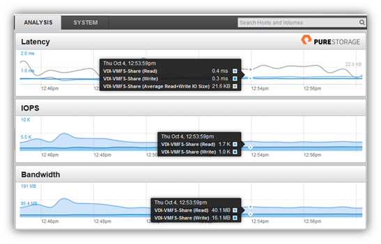In our lab, we were fortunate to get our hands on an all flash PureStorage array with some pretty awesome low latency IO delivery capabilities. Keep in mind, it is a lab, so this config is not a validated design or in our HCL right now, but it does give us an idea of the storm to hit the storage when there is a low latency storage device behind the VDI cluster.