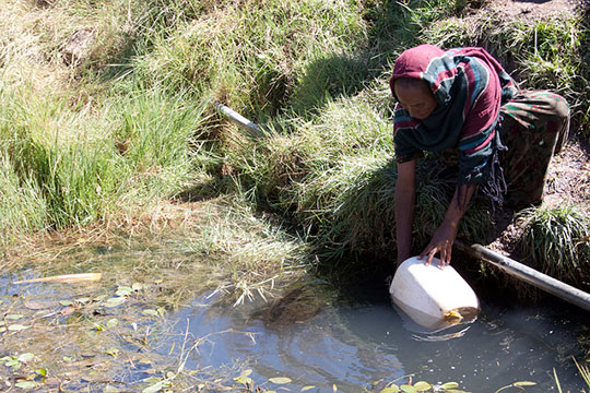An Ethiopian woman gathers water from a contaminated source. Courtesy Water.org