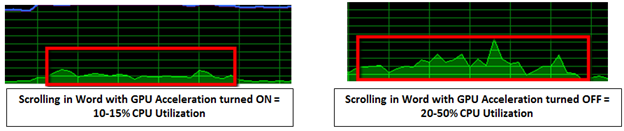 Try it out yourself with this simple test. Open Task Manager and Word, let your system come to idle, then start scrolling up and down and watch your CPU utilization. Then go into Options/Advanced and check the box that says "Disable Hardware Graphics Acceleration" under Display. See the difference in simple scrolling in a word document?