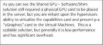 We've played with GPU's in servers for VDI before, what makes this so special? If you look closely, you'll see that the GRID cards are able to be partitioned into smaller card segments. This is NOT the same thing as software/shim approaches to "virtualize" the GPU and share it amongst several desktops. This is also NOT the same as Pass-through GPU's (1 VM to 1 GPU core). The GRID cards can be hardware partitioned into various video cards -this is called vGPU. There are several advantages to using vGPU over software/Shim solutions: