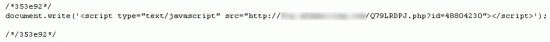 Two comments containing a hexadecimal colour reference flank an instruction to the browser to download JavaScript from a PHP file on a second compromised website. The name of this PHP file always follows the same pattern: 8 mixed case alpha numeric characters with a parameter accepting an eight digit id value. The PHP file only responds once per ID value. If accessed more than once, the page returns a 403 forbidden error, otherwise malicious JavaScript is returned to be executed in the visitor's browser.