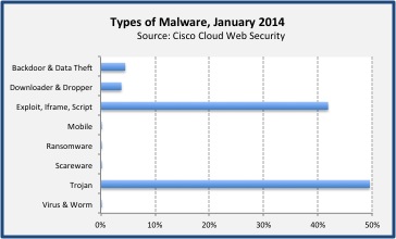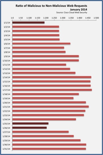 January 2014 started with a bang, with one in every 191 web requests resulting in a web malware encounter. The Cisco Computer Security Incident Response Team (CSIRT) observed this same trend, witnessing a 200% increase in web malware encounters experienced by Cisco employees for the month. Overall, January 1, 25, and 26 were the highest risk days for encountering web delivered malware. In the chart below, the lower the number, the higher the risk of encounters. Still, with a median encounter rate of 1:375 requests, every day of January 2014 represented significant risk for web browsing.