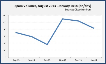 Spam volume decreased by 20% in January 2014 compared to December 2013, though still continuing with the higher volume observed in November 2013. Contributing to this higher volume were malicious email masquerading as correspondence from the Royal Bank of Scotland and Land Registry. The email carried a malicious zip attachment containing a generic downloader trojan. Sender addresses, and message bodies varied, with subjects that included Important Docs, Account Report, and QuickBooks Invoice. Example attachment names included Docs_14012014.zip, Docs.zip, and Notification_1401.zip.