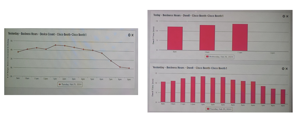 Here we can see that within the Cisco booth alone, 750 unique devices were seen before 11.30am, with an average dwell time of just over 26 minutes. This mirrors the feeling on the ground the the event started slowly this morning and got really busy from 10 am onwards.