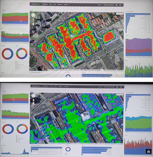 Here we can see a realtime view of the venue, a heat map of the congress halls, the most used apps, the traffic volumes, devices being used, the number of clients, social media traffic etc.