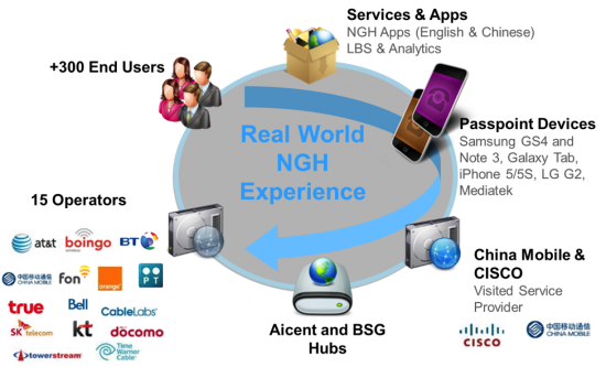- NGH Wi-Fi roaming with 15 global operators through the host operator China Mobile and local hubs Aicent and BSG. The participating operators were AT&T, Bell Mobility, Boingo Wireless, BT, CableLabs, FON Wireless, KT, NTT DOCOMO, Orange France, SK Telecom, Time Warner Cable, Portugal Telecom, Towerstream, and True International.